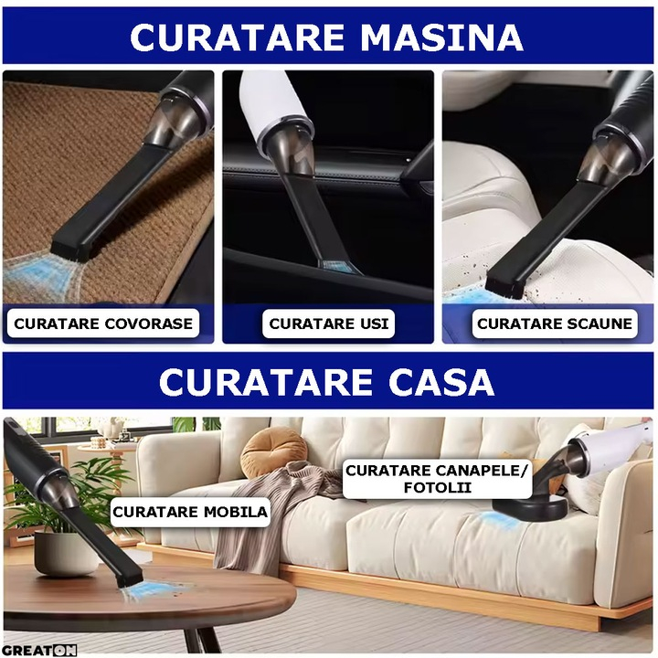 Designul portabil și reîncărcabil îl face ușor de utilizat fără fir, oferind libertate de mișcare și acces facil la toate colțurile vehiculului. Compact și ergonomic, aspiratorul este ușor de depozitat și pregătit pentru utilizări repetate, fiind ideal și pentru apartamente mici sau birouri.