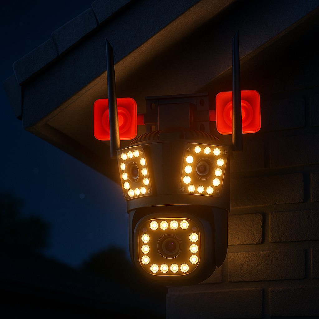 Acest model de cameră de supraveghere triplă este una dintre cele mai căutate soluții pe piața actuală, datorită versatilității, autonomiei și funcțiilor inteligente. Este proiectată pentru a acoperi atât cerințele clienților casnici, cât și nevoile spațiilor comerciale, fiind un produs ideal pentru revânzare.