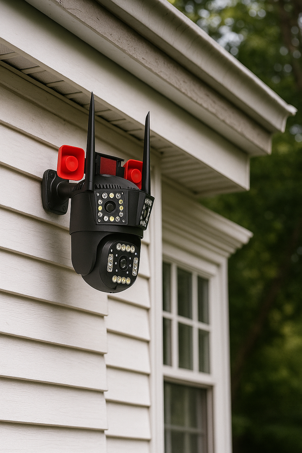 Cameră de Supraveghere Triplă (3 lentile) WiFi/4G, 12MP Ultra HD, PTZ, Zoom 5X, Night Vision Color, Comunicare Bidirecțională – Soluție completă pentru securitate modernă