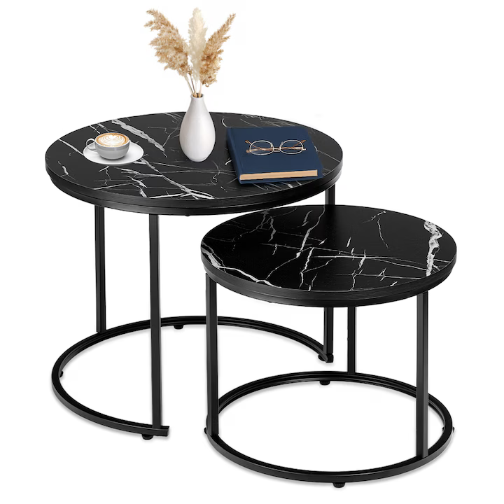 Măsuță Cafea 2-în-1, Blat Marmură Neagră, Cadru Oțel Negru Mat, 53x43 cm, Suportă Până la 30 kg, Mese Suprapuse, Design Modern și Compact este soluția ideală pentru living sau birou, combinând funcționalitatea cu estetica modernă. Designul 2-în-1 cu mese suprapuse permite economisirea spațiului și oferă versatilitate în utilizare, fiind potrivită pentru servirea cafelei, depozitarea obiectelor decorative sau organizarea rapidă a spațiului.