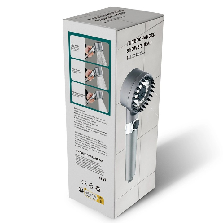 Pară Duș 4 în 1 cu Perie Masaj, Filtru Purificare Apă și 4 Moduri de Presiune, Economizor de Apă, Turbo Boost, ABS + Silicon – Gri engross