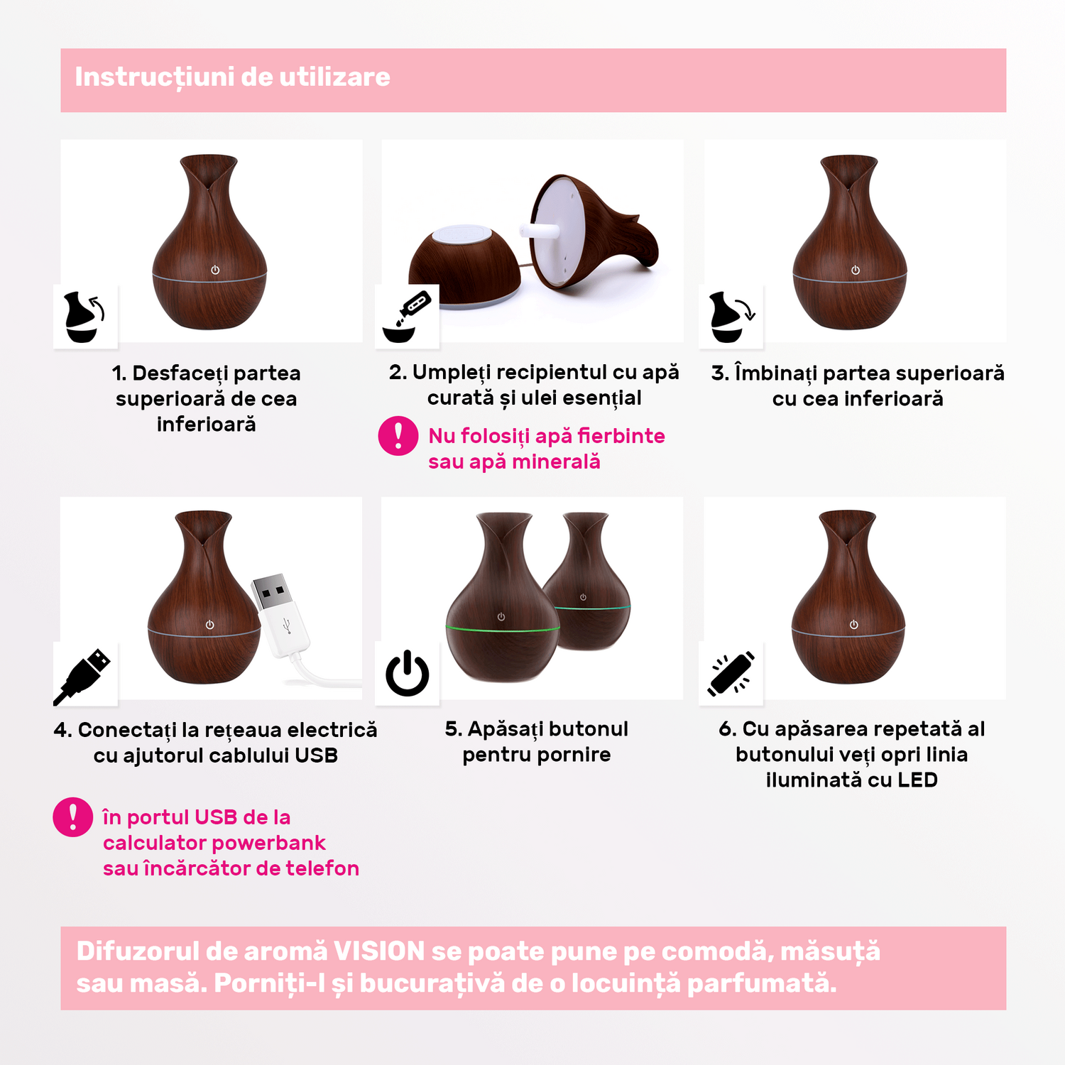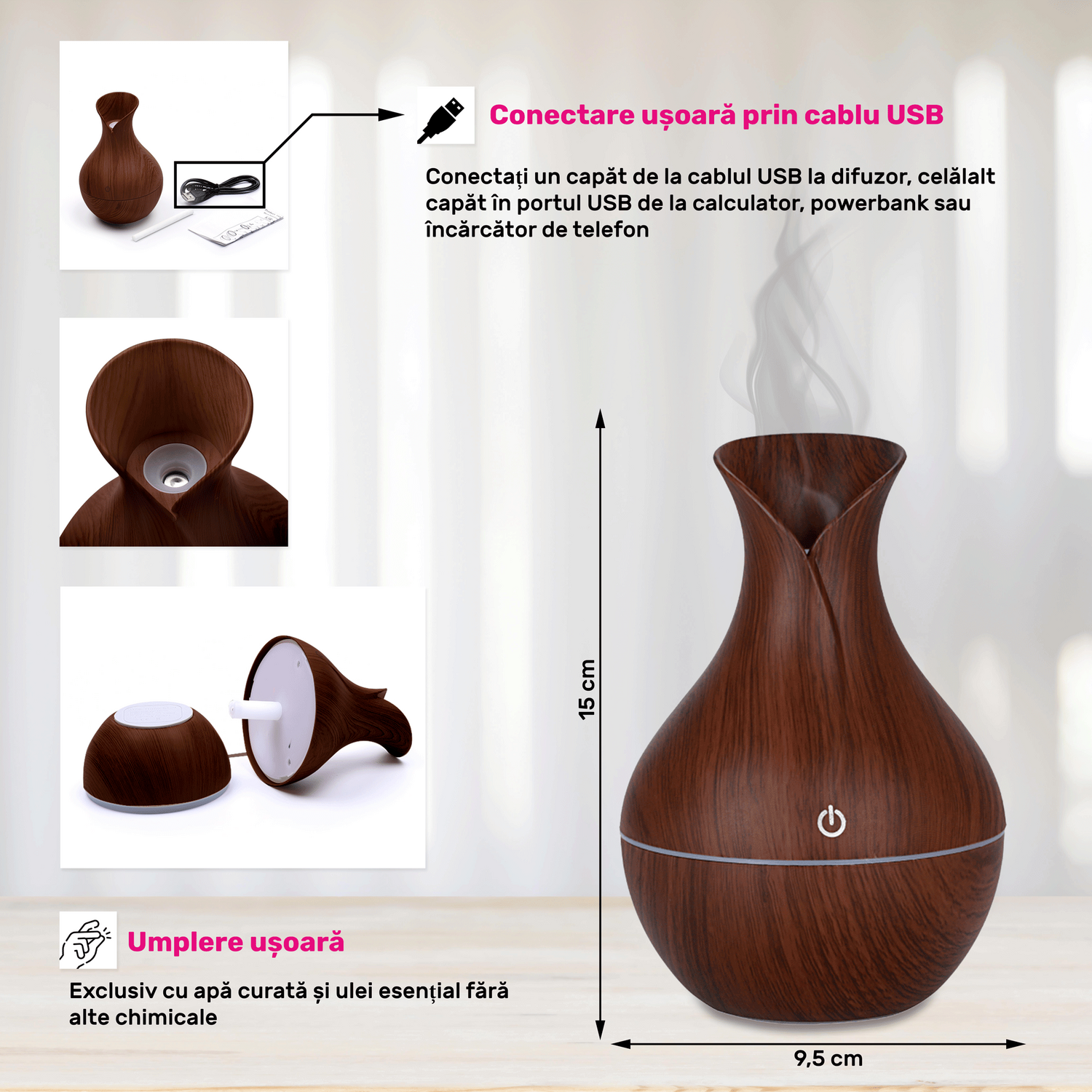 • Ideal pentru aromaterapie și umidificarea aerului în spații mici
