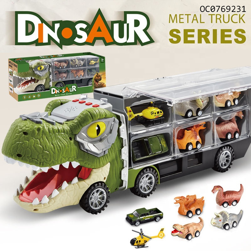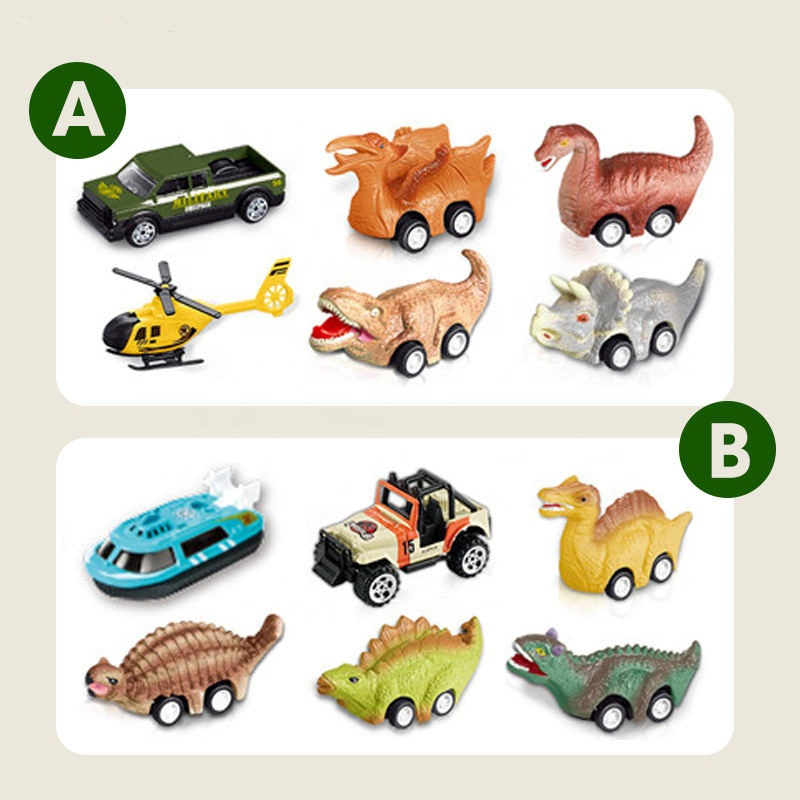 Set inclus: 1 camion dinozaur + 6 vehicule pull-back (Set A sau B, cu jeep-uri, pick-up, elicopter și dinozauri)