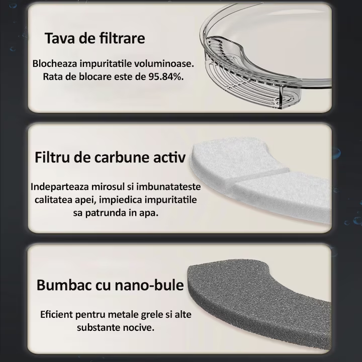 Dispenserul automat de apă tip fântână este un produs premium și extrem de căutat în categoria accesoriilor pentru animale de companie. Asigură hidratarea constantă și sănătoasă a pisicilor și câinilor, fiind echipat cu sistem de filtrare cu cărbuni activi, motor ultra-silențios și iluminare LED estetică.